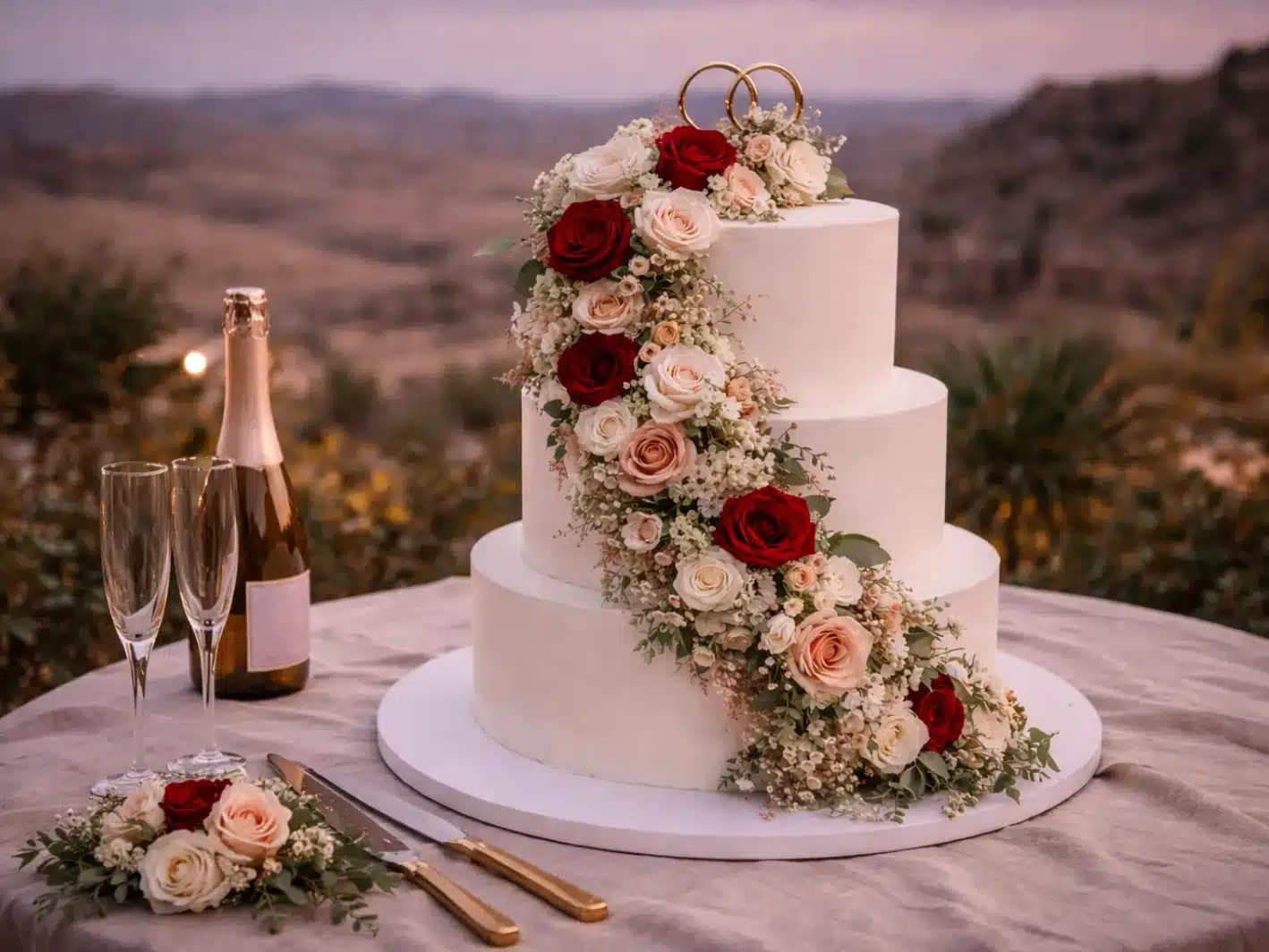 • Service: Florist applies flowers to cake on-site (coordination with caterer).