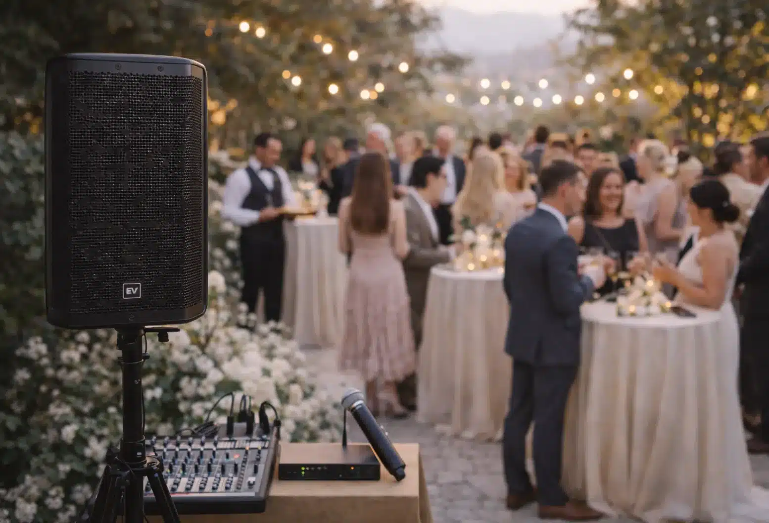 Whether you are in a vast garden or a tight courtyard, we can position discreet, battery-powered speakers that eliminate ugly cable runs. The result is a consistent, lounge-style vibe that maintains the energy between the ceremony and dinner, keeping the momentum of the celebration moving forward.
