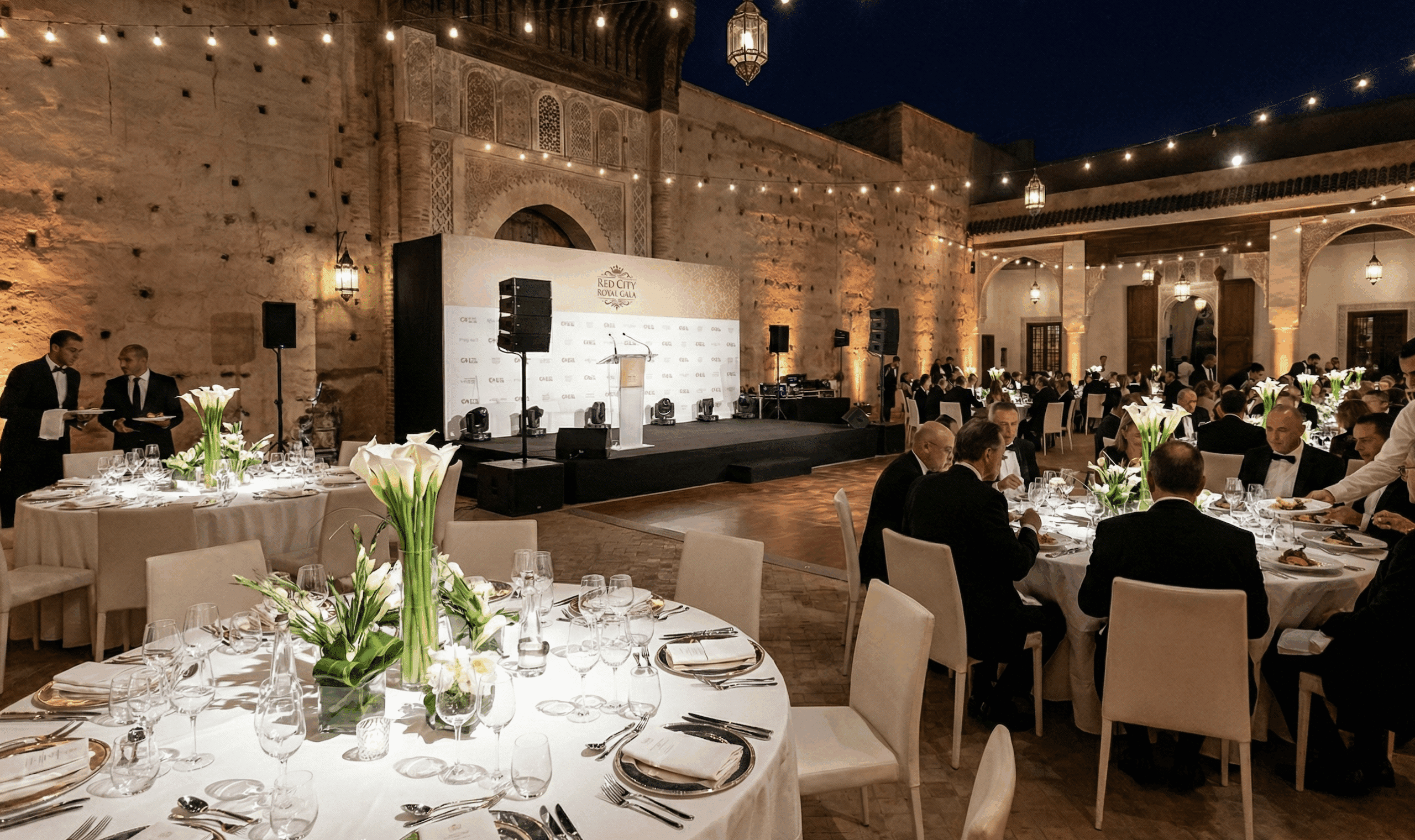 Elevate your brand with our Corporate gala dinner Marrakech, a turnkey solution designed specifically for high-stakes corporate events where precision is paramount. We provide the infrastructure to impress even the most discerning executives, featuring branded lighting projection (GOBO) to put your company name in lights, and a structured run-of-show environment. This is not just about decoration; it is about creating an environment of authority and innovation.