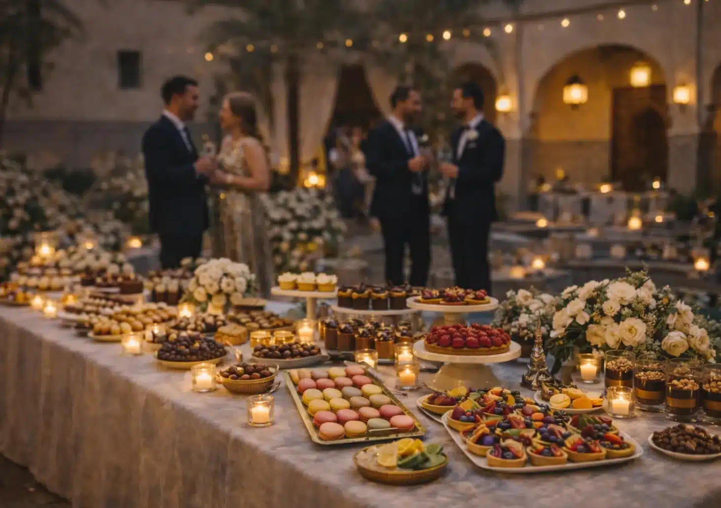 Satisfy the sweet tooth without interrupting the party with our Wedding dessert bar Marrakech. Instead of a heavy, plated dessert that guests often ignore after a big meal, this station allows them to grab a delicate macaron, a lemon tart, or a mini éclair and head straight to the dance floor. It offers variety, freedom, and visual appeal, displayed on elegant tiered stands and slate platters.