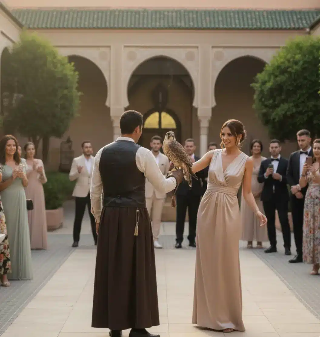 Channeling Arabian royalty. A handler with a trained falcon poses with guests for photos. It creates a striking, dramatic image—formal wear and a bird of prey—that lights up social media.