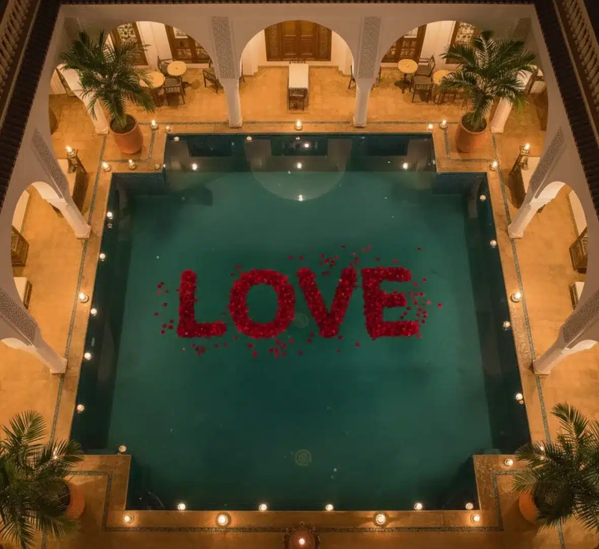 Turn your venue’s water feature into a stunning centerpiece with our Floating pool flowers Marrakech, ensuring the pool remains a visual asset even after dark. Many Riads and Villas feature a central pool, which can look like a dark, uninviting “black hole” at night if left unlit. We solve this by installing large styrofoam initials (e.g., “A & M”) or shapes, fully covered in fresh flower heads like Chrysanthemums or Carnations.