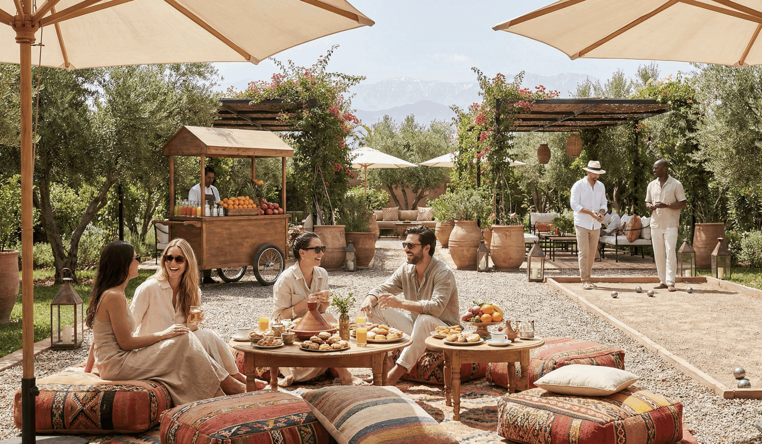 Picnic style setup with low tables and parasols.