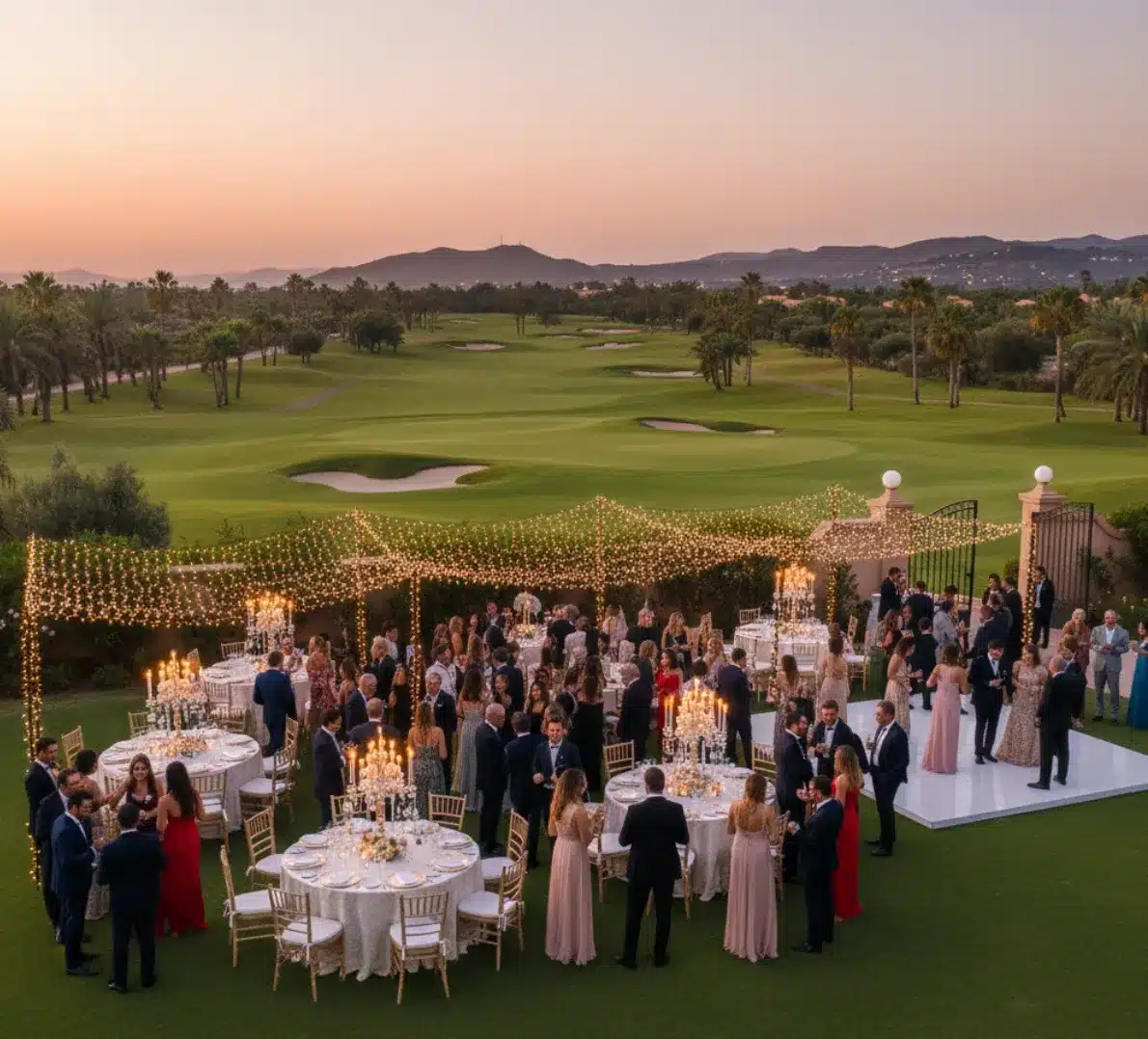 Enjoy the pristine perfection of a manicured landscape with our Golf front villa rental Marrakech, offering a polished alternative to the rugged terrain of the desert. If you hate dust, uneven ground, or the unpredictability of nature, this is your fix. Situated on a prestigious golf course, the venue offers carpet-flat grass that is perfectly safe for stilettos and floor-length gowns, paired with a view that stretches endlessly toward the horizon.