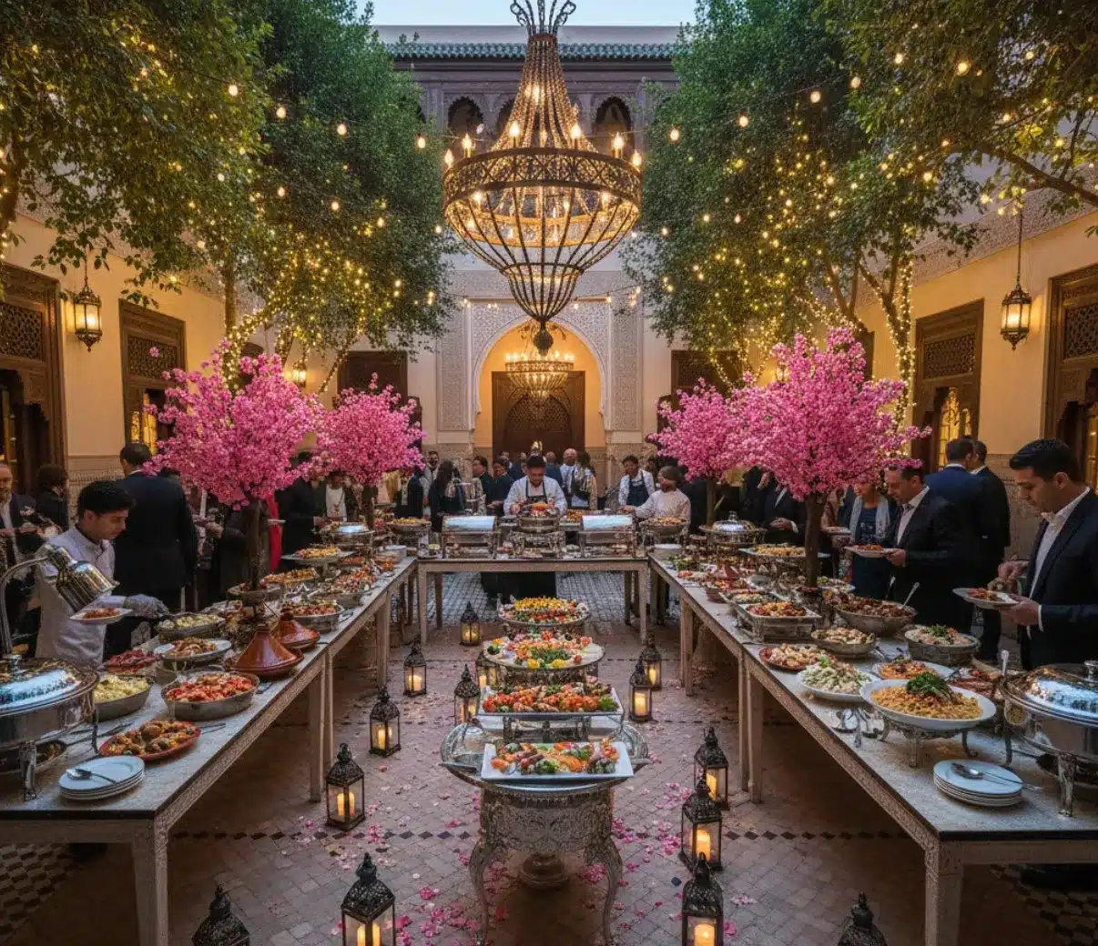 Solve the headache of diverse dietary needs with our generous Luxury wedding buffet Marrakech, a solution that ensures vegetarians, meat lovers, and picky eaters alike leave the table satisfied. Visually, the setup is stunning—stations overflowing with colors and textures, looking full and inviting. We move beyond standard chafing dishes to create distinct culinary zones, such as a vibrant Moroccan salad bar, an Asian wok station, or a fresh Italian pasta corner.