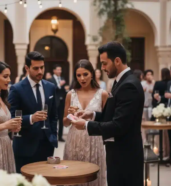 The cure for awkward small talk. Our magician moves through the crowd during cocktails, performing close-up tricks that get strangers talking and laughing together before they’ve even had a drink.