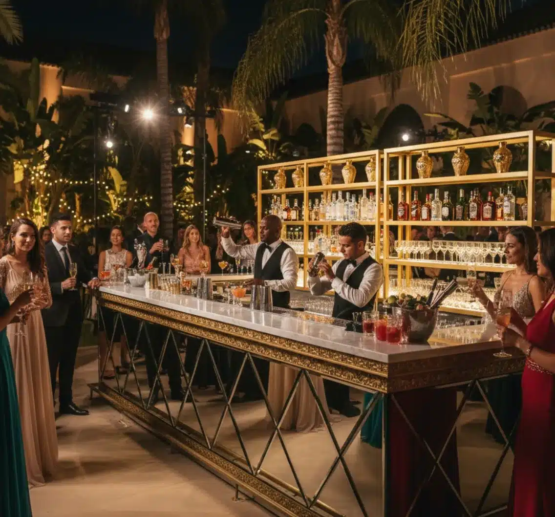 Transform your beverage service into a dazzling art installation with our Mirror bar rental Marrakech, a statement piece designed to ignite the party atmosphere. Clad in gold or silver mirror acrylic panels, this bar reflects the dance floor lights, the flickering candles, and the movement of the crowd, adding a layer of sparkle and kinetic energy to the room. It screams “party time” and serves as the perfect centerpiece for a glam-inspired reception.