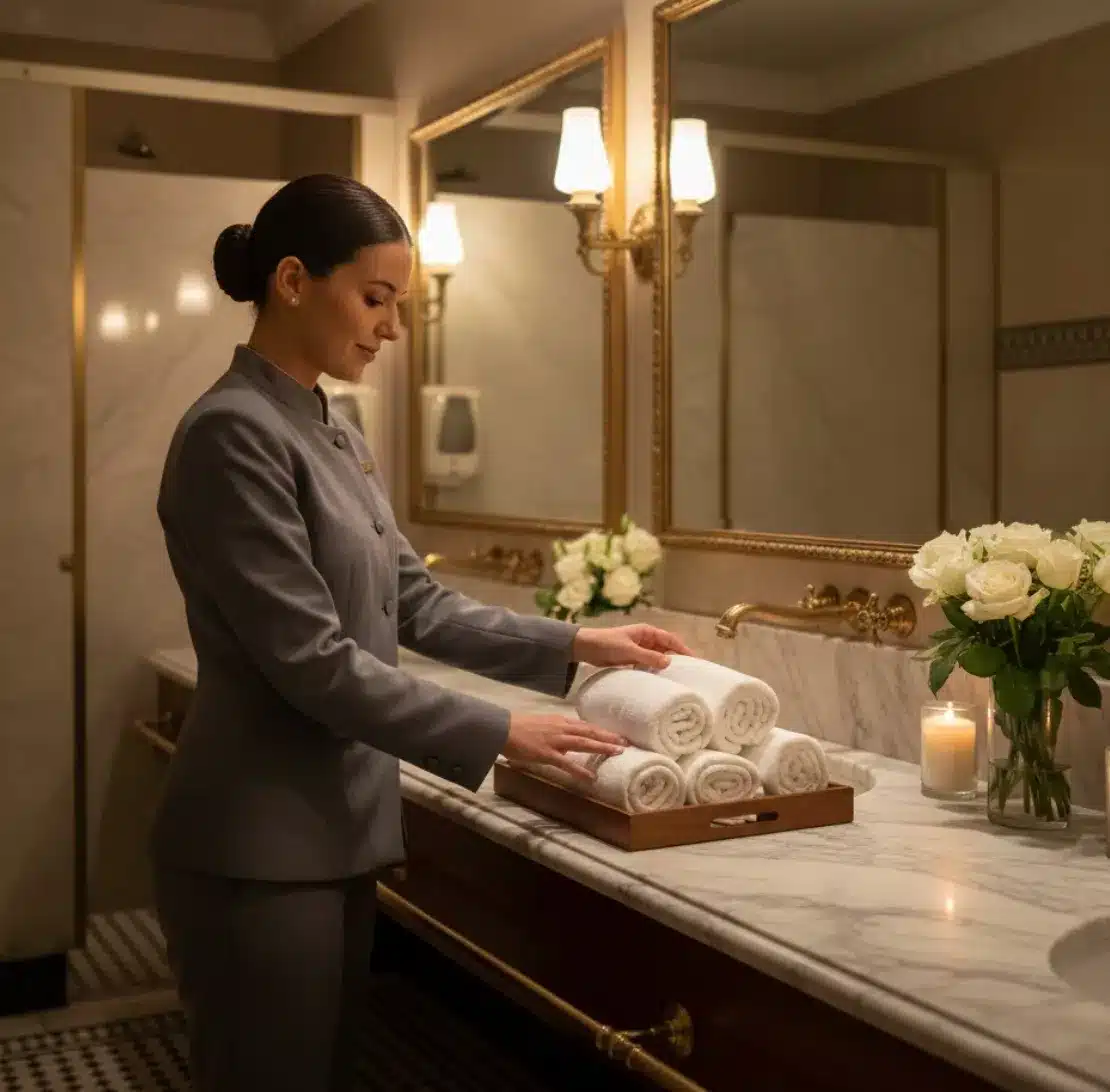 The detail everyone forgets until it’s too late. We keep the facilities stocked and spotless all night. It maintains the illusion of luxury—no mess, no paper on the floor, just clean space.
