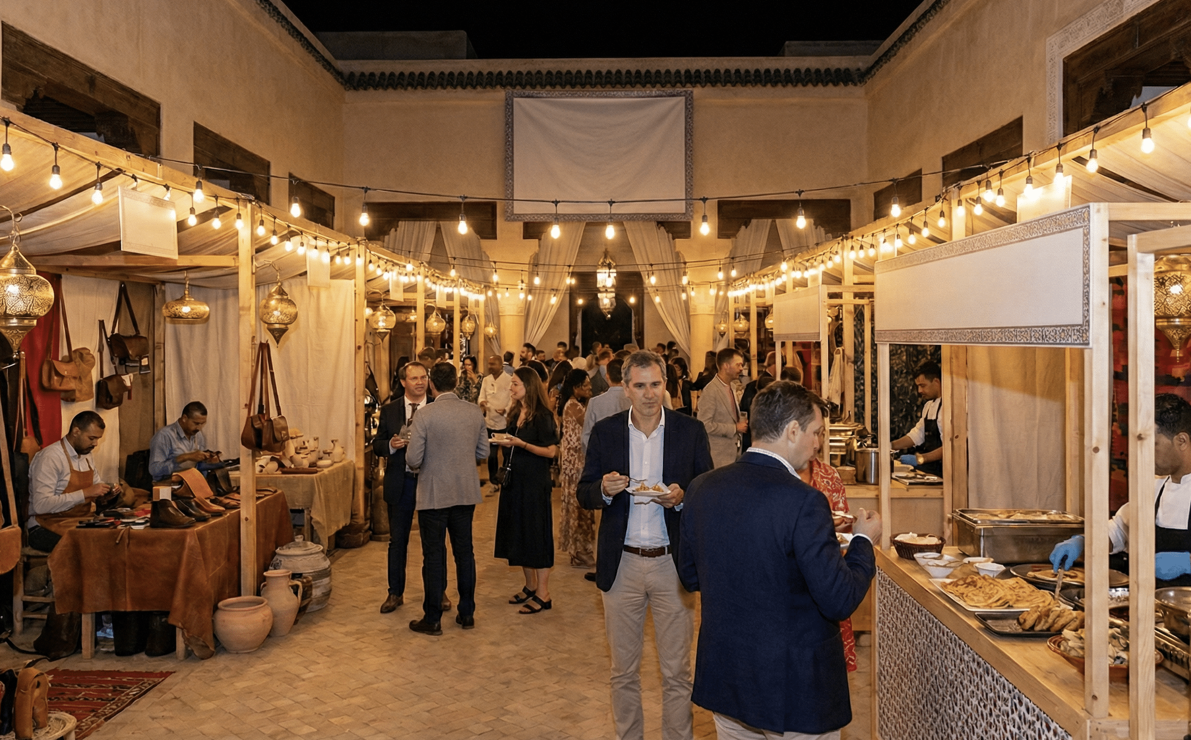 The event features live artisans demonstrating their ancient crafts—a calligrapher writing guests’ names, a craftsman working leather or pottery, and a henna artist adorning hands with intricate designs. To complete the sensory experience, we set up “street food” stalls serving fresh crepes and grills, alongside a traditional tea station with a master pourer. It is culturally rich, visually stunning, and deeply engaging.