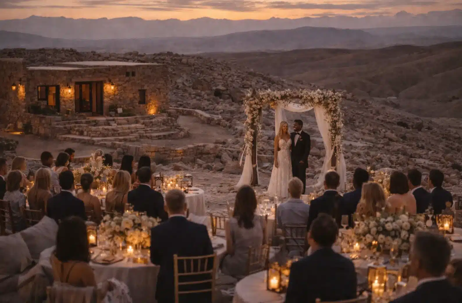 Redefine desert luxury with our Stone desert lodge venue, a “rough-luxe” sanctuary where the drama of the Agafay stone desert meets refined hospitality. While many expect sand dunes, Agafay is about the moon-like beauty of stone and vast open horizons. The visual contrast here is striking: the harsh, prehistoric landscape creates a stunning backdrop for soft wedding decor, white florals, and elegant evening wear. It is a place of textures, where the rugged outdoors enhances the comfort of the indoors.