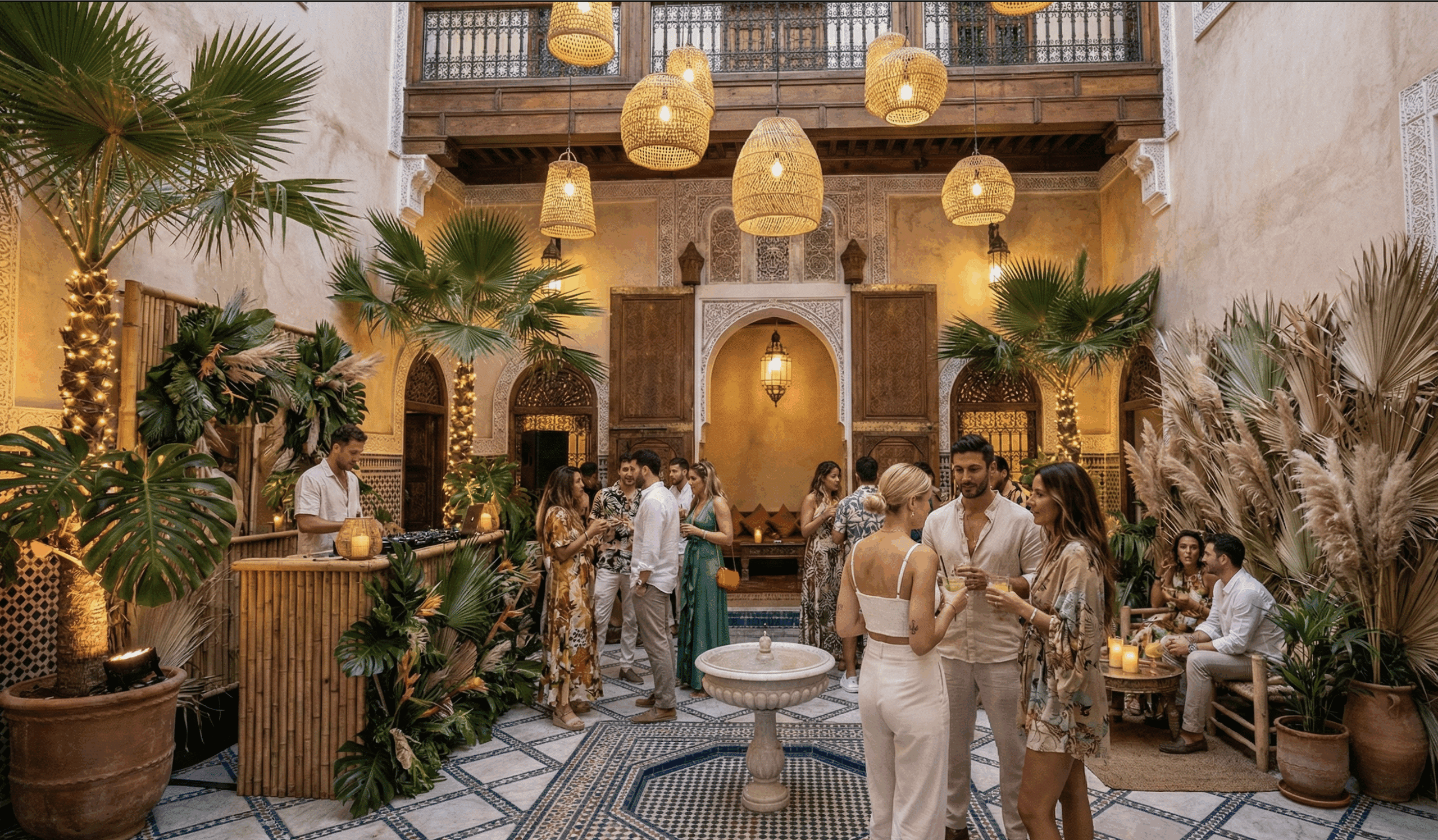 Ignite the night with our Tropical disco party Marrakech, a high-octane concept that transforms any traditional Riad courtyard into an electric, world-class club. This is where the wild elegance of the jungle meets the retro glam of the Studio 54 era. We create a “Neon Jungle” featuring a custom photo wall, signature tiki cocktails utilizing local fruits, and a DJ booth framed by giant monstera leaves, setting the stage for a high-energy celebration that goes until dawn.